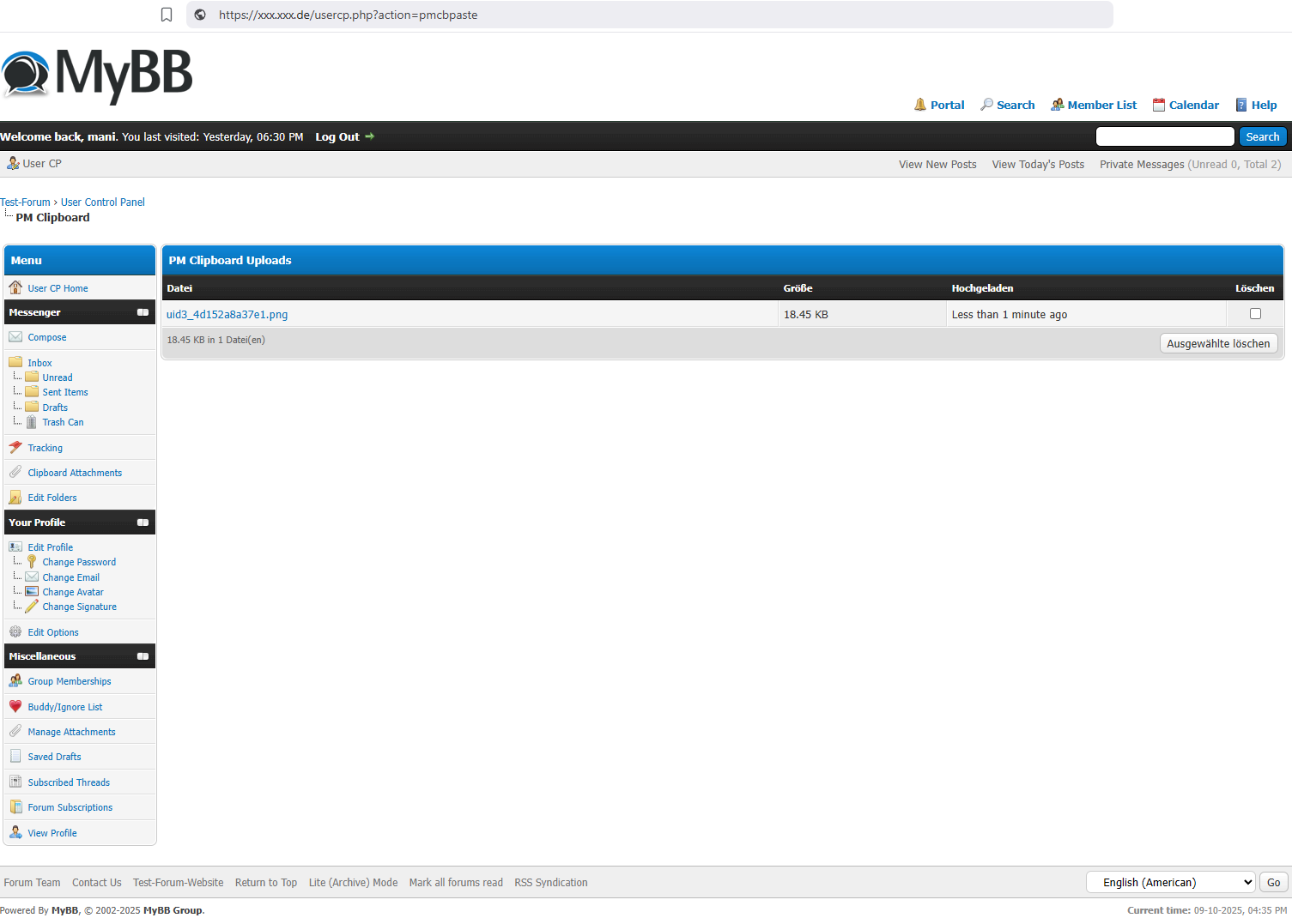 Delete function for single or multiple file uploads for user added in usercp under messages clipboard attachments
