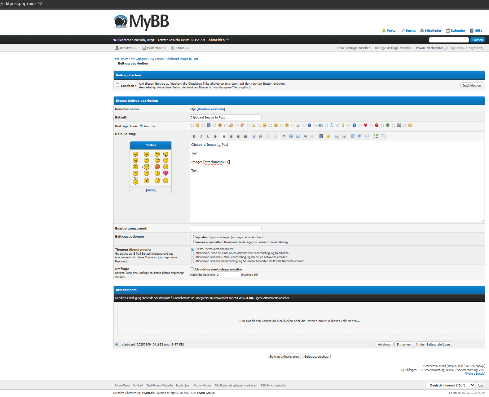 Upload: The plugin uploads the file using the MyBB upload function (e.g. as a clipboard_YYYYMMDD_HHMMSS.png).