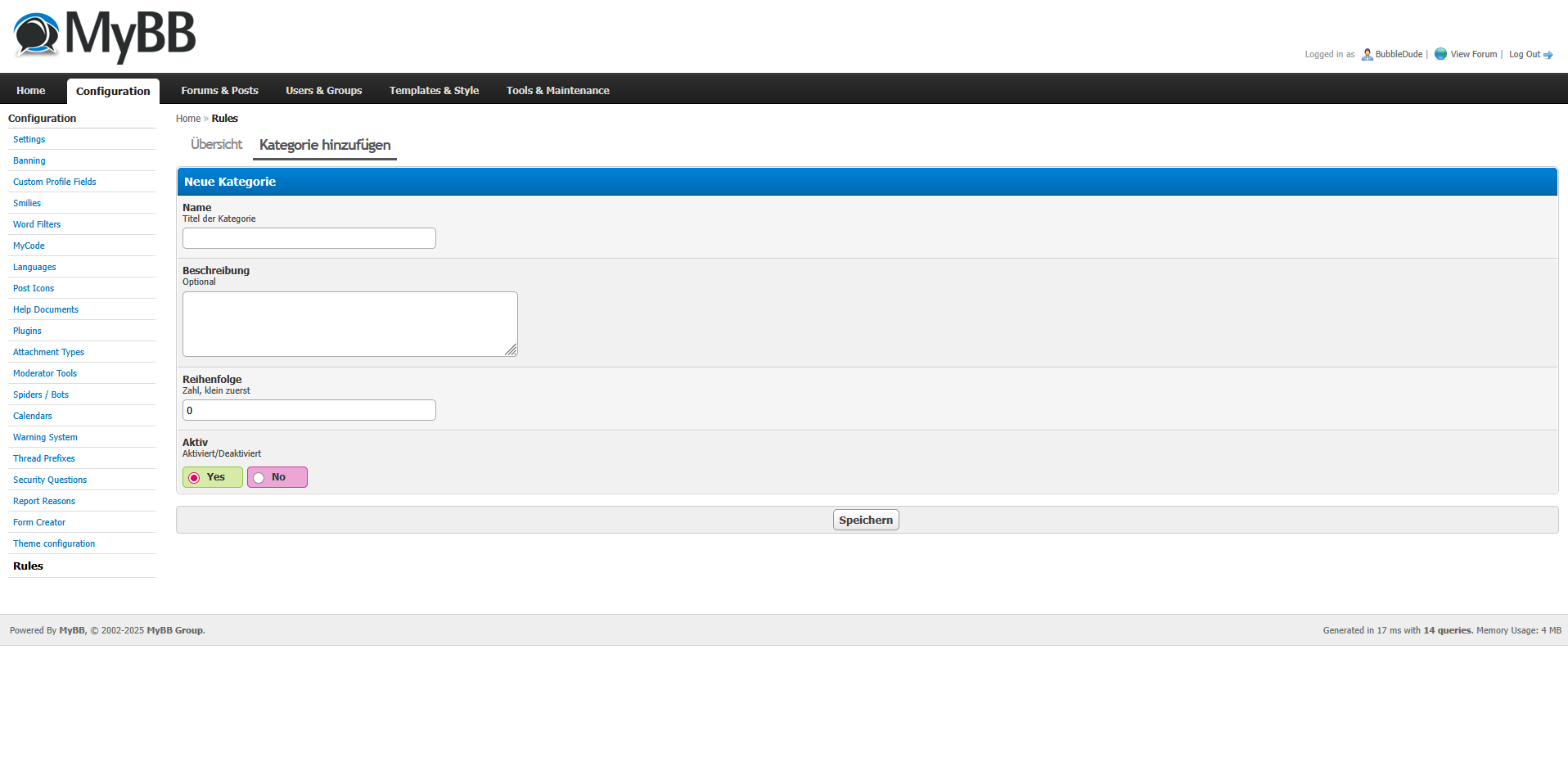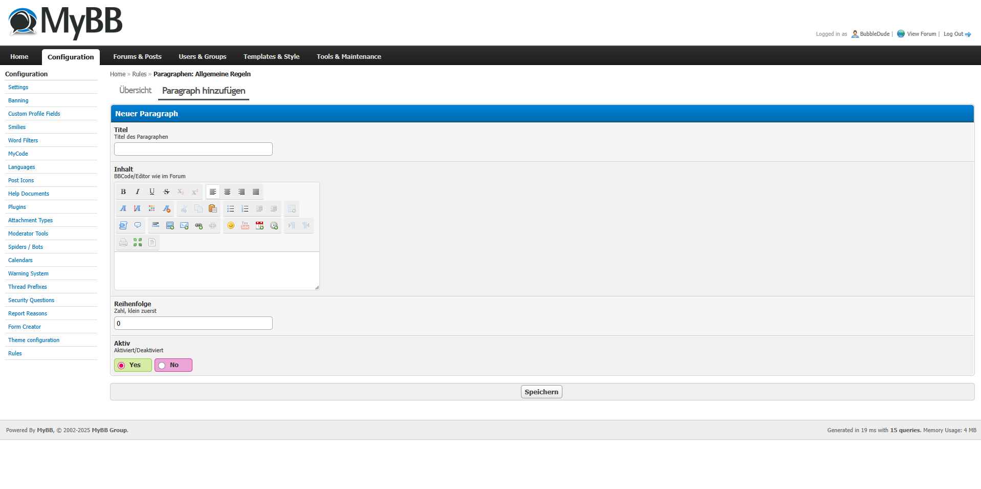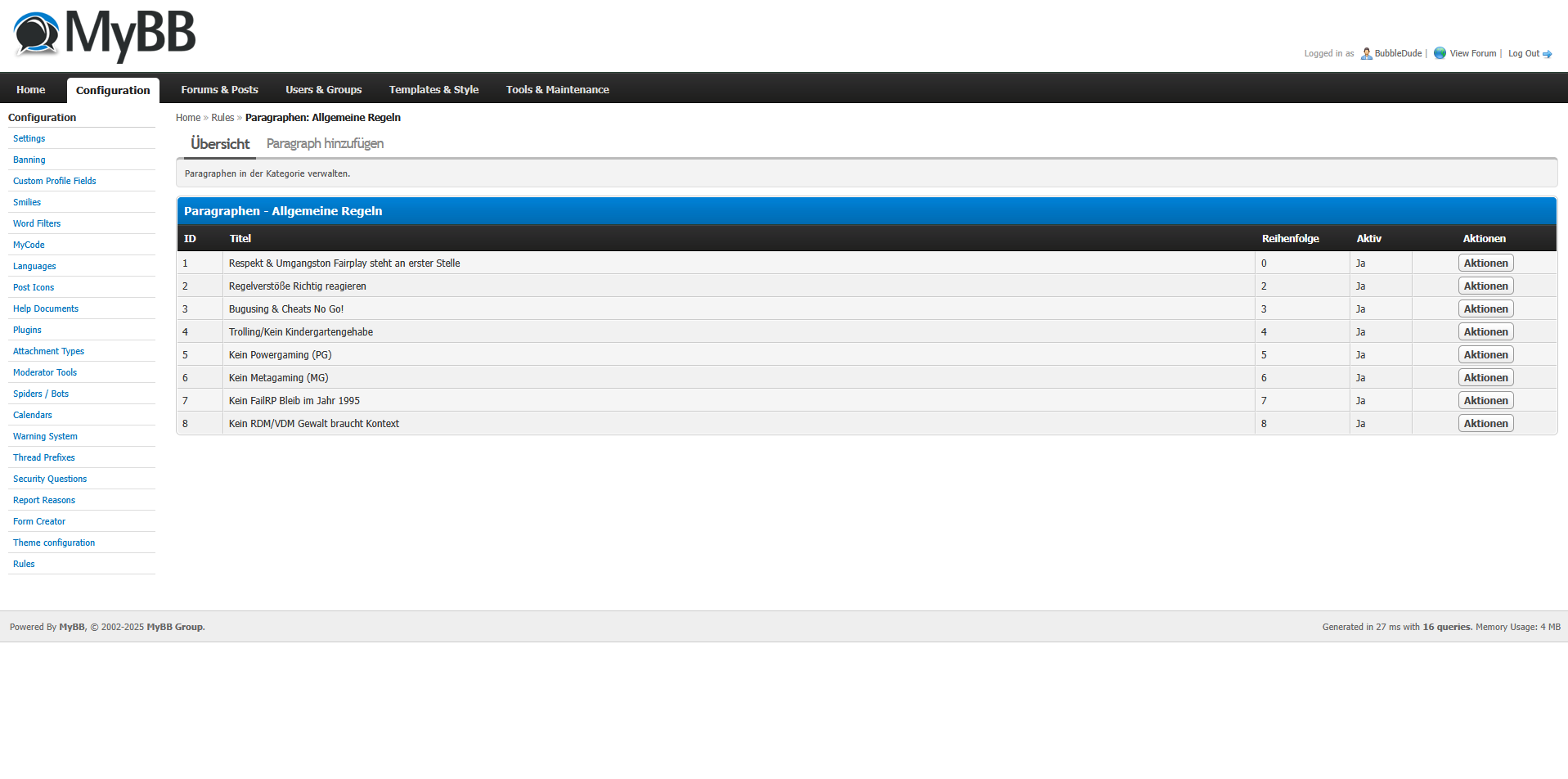 The Rules Manager plugin lets administrators structure forum rules into categories and paragraphs, edit them with the familiar MyBB editor, and present them neatly on a frontend page.
