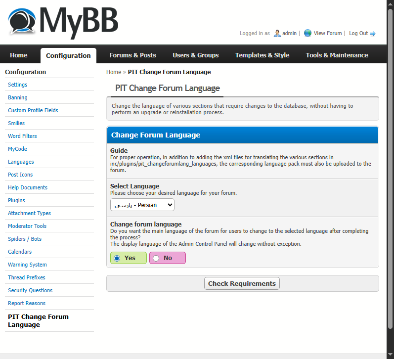 3- When you want to avoid language dependency to generate packages for different communities (like Iran, China, Russia, France, etc.) for each version and there is no need to fully customize MyBB with each version. With this plugin, after installation or upgrade, users only need to install it and apply the desired language. (Only once and then deactivate the plugin)