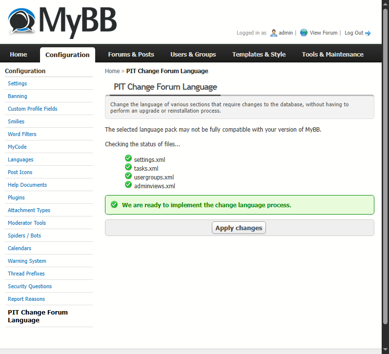 Để hoạt động chính xác và hợp lý, gói ngôn ngữ MyBB tương ứng cũng phải có mặt trong diễn đàn để bạn có thể xem nó để lựa chọn trong plugin. (Chắc chắn không có ý nghĩa gì khi có phần cài đặt bằng tiếng Nga trong ACP với tiếng Trung Quốc -- tuy nhiên, chúng tôi có thể thay đổi điều này nếu người dùng yêu cầu và cần.)