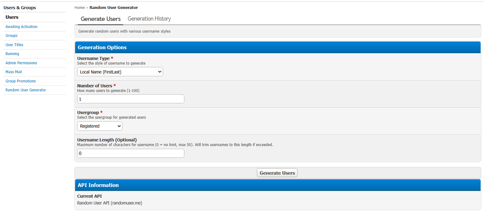 - Access via Admin CP > Users & Groups > Random User Generator