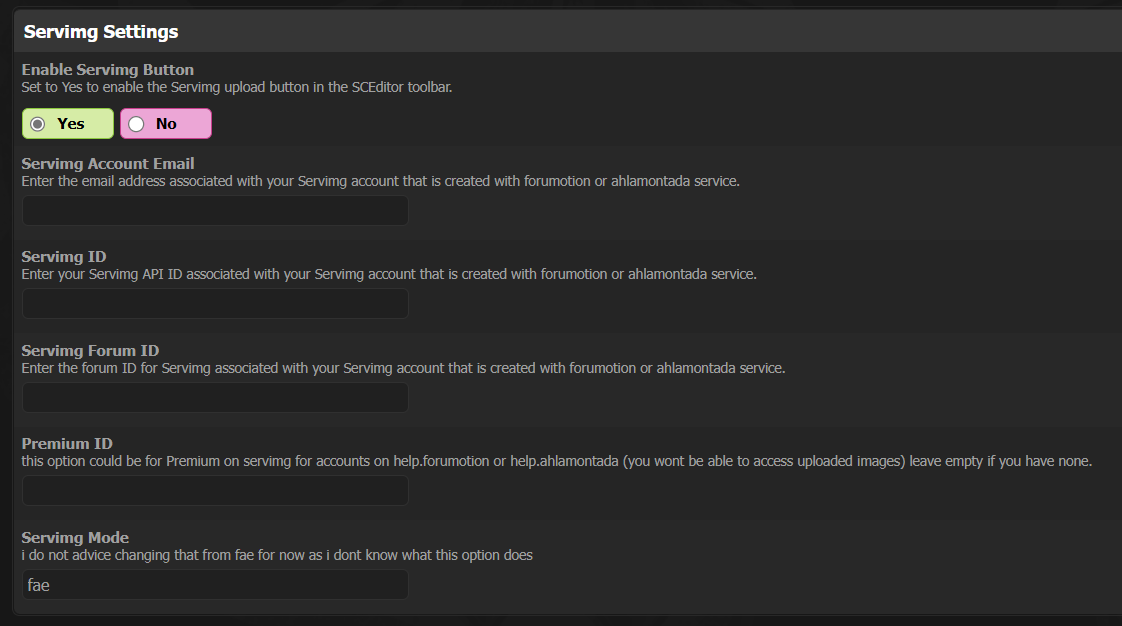 Các giá trị này mà bạn sẽ tìm thấy ở cuối trang, là dữ liệu cho tài khoản servimg sau khi bạn cài đặt tiện ích mở rộng trong bảng quản trị mybb, bạn sẽ tìm thấy một cài đặt đặc biệt cho servimg